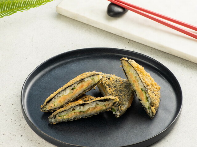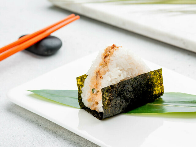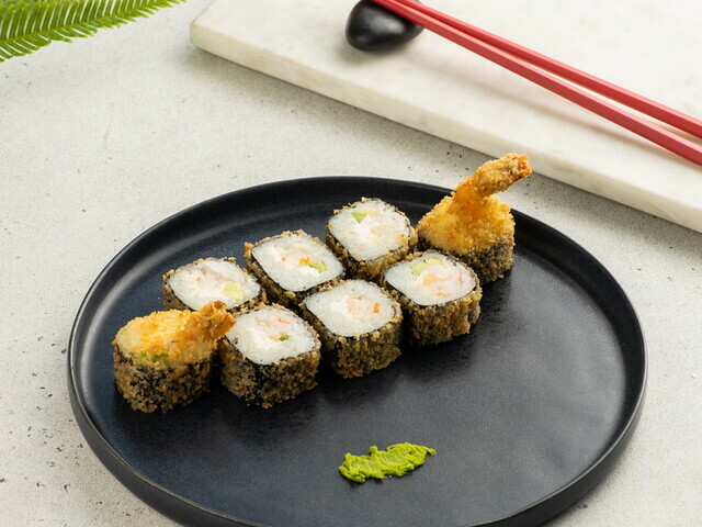 Рис, нори, креветка темпура, лосось, сыр сливочный, соус васаби, лук зелёный, кунжут.