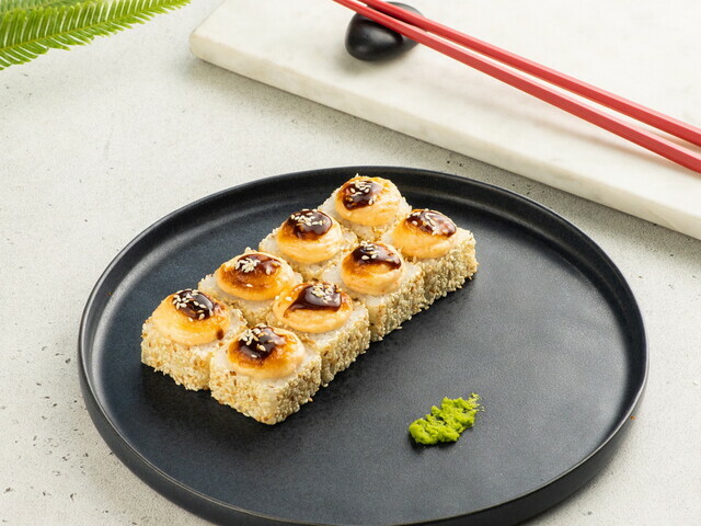 Рис, нори, сыр сливочный, лосось, огурец, соус унаги, кунжут.