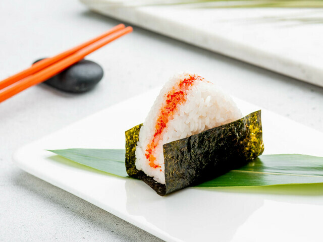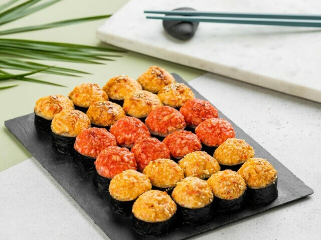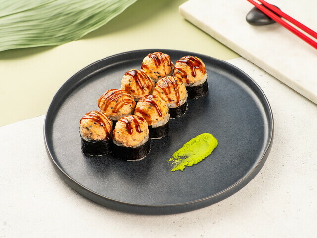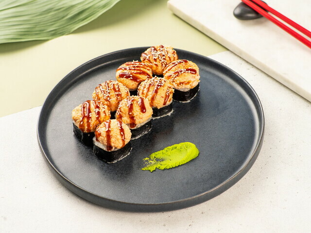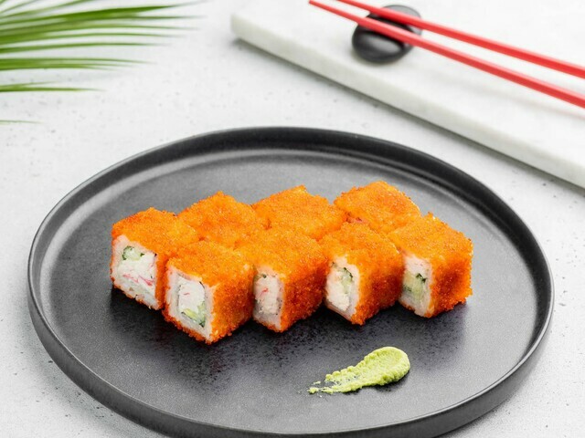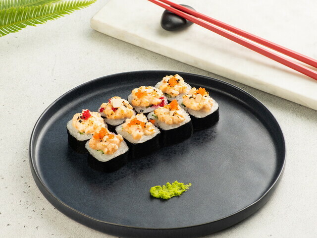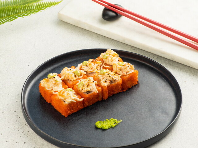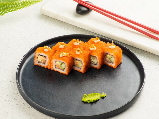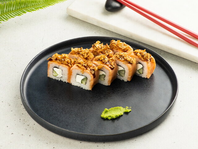Рис, нори, лосось, сыр сливочный, огурец, икра масаго, соус спайси, луковый кранч.