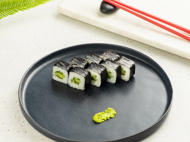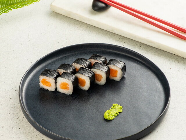 Рис, нори, лосось, огурец, соус чесночный, соус унаги.