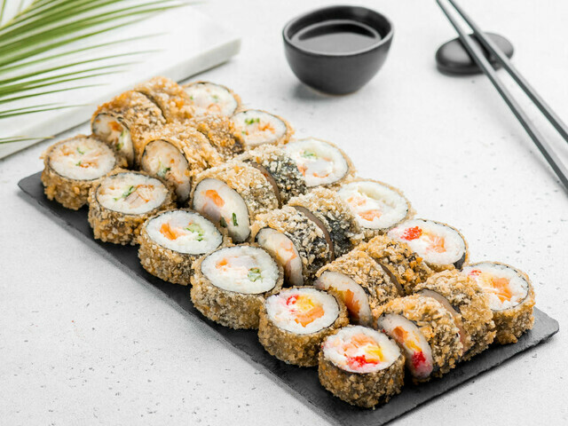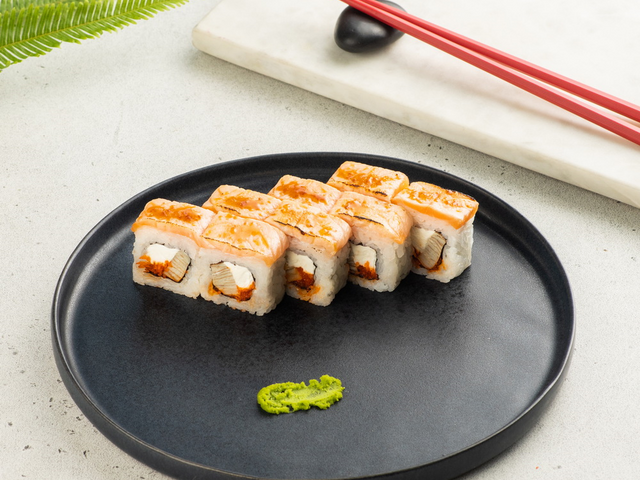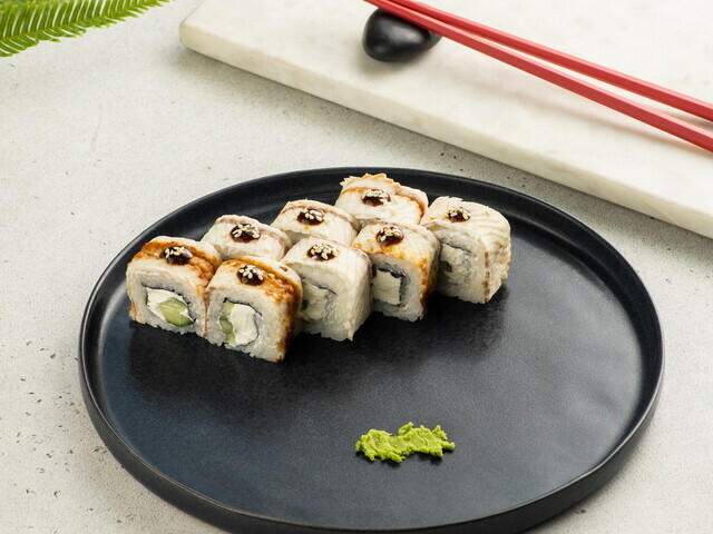 Рис, угорь, омлет Тамаго, огурец, сыр сливочный, соус кунжутный, темпура.