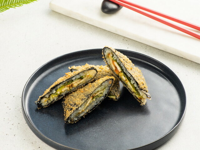 Рис, нори, сыр сливочный, креветка темпура, икра масаго, салат айсберг, краб чесночный.