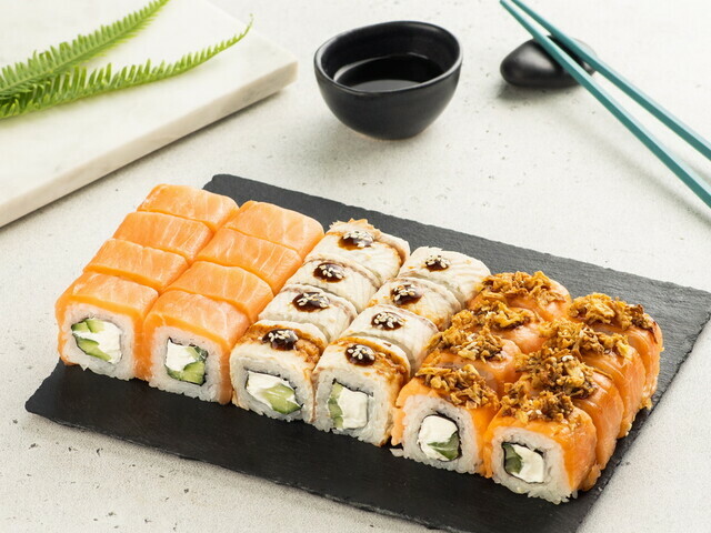 Нежная филадельфия с лососем, лосось с угрем и соусом унаги, острый лосось с омлетом и креветкой