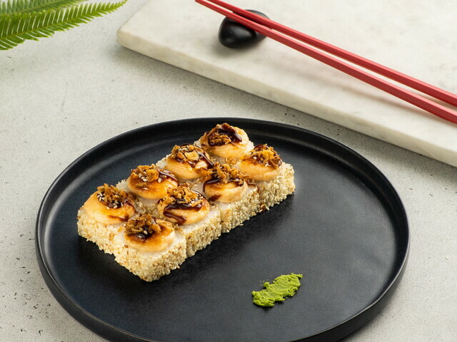 Рис, нори, лосось, сыр сливочный, огурец, сырный соус, луковый кранч, соус унаги.