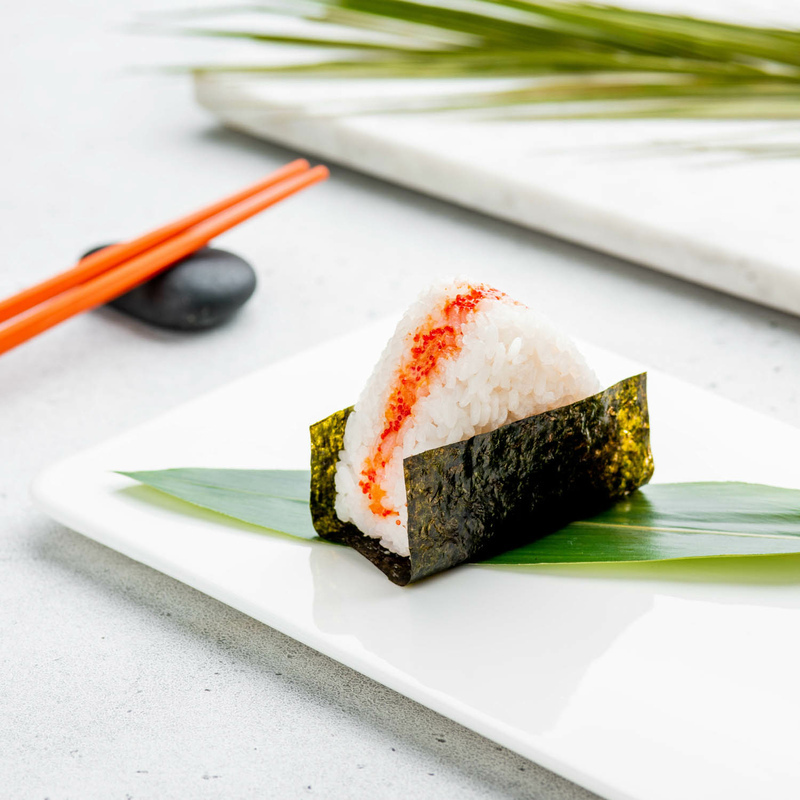 Лосось, соус спайси, икра тобико, нори.