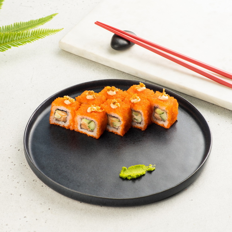 Рис, нори, лосось, сыр сливочный, огурец, икра масаго, соус спайси, луковый кранч.