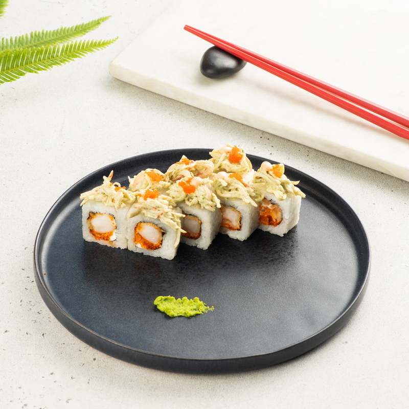 Рис, нори, сыр сливочный, креветка темпура, икра масаго, салат айсберг, краб чесночный.