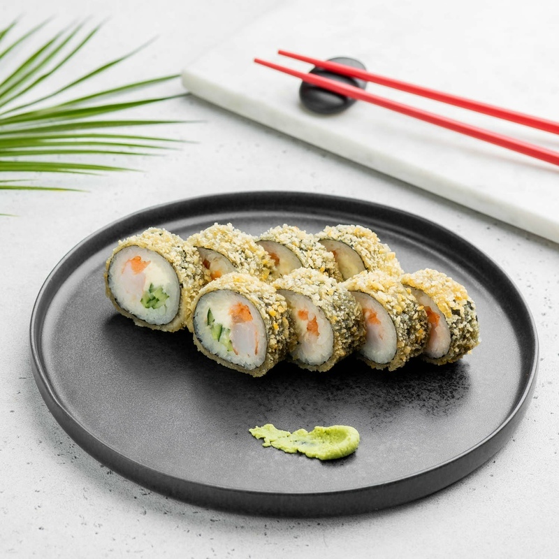 Рис, лосось, сыр сливочный, огурец, такуан.