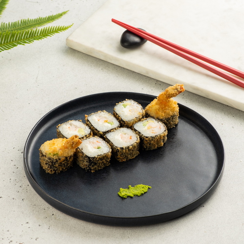 Рис, нори, креветки, огурец, сыр сливочный, соус унаги.