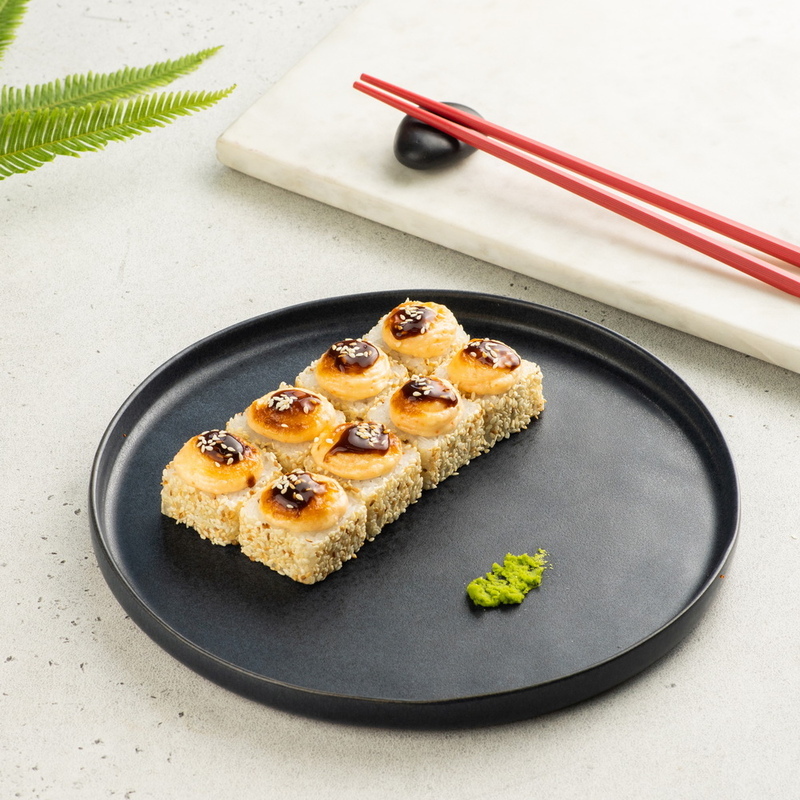 Рис, нори, краб, огурец, чесночный соус, сырный соус, кунжут, соус унаги.