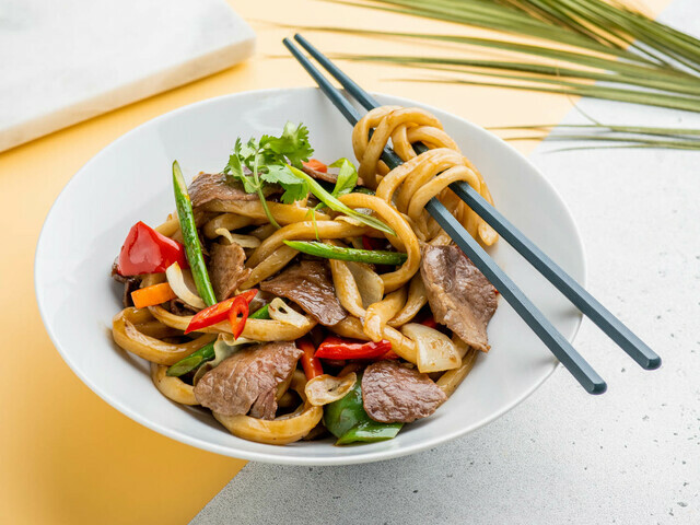 Лапша удон, говядина, чесночные стрелки, болгарский перец, морковь, лук, капуста белокочаная, имбирь, чеснок, соус вок