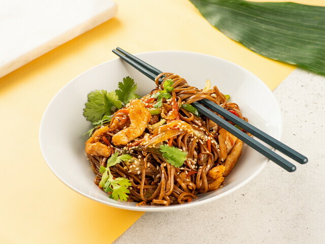 Соба гречневая, филе куриное, перец болгарский, лук репчатый, морковь, стрелки чесночные, капуста белокочанная, соус кунг пао, соус пад-тай, кунжут, кинза.