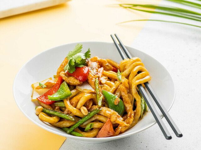 Лапша удон, филе куриное, перец болгарский, лук репчатый, морковь, стрелки чесночные, капуста белокочанная, соус кунг пао.
