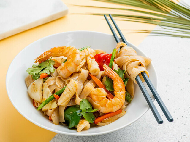 Лапша рисовая, тигровые креветки, кальмар, лук репчатый, капуста белокочанная, соус Пад-тай, кинза, арахис чили, лайм.