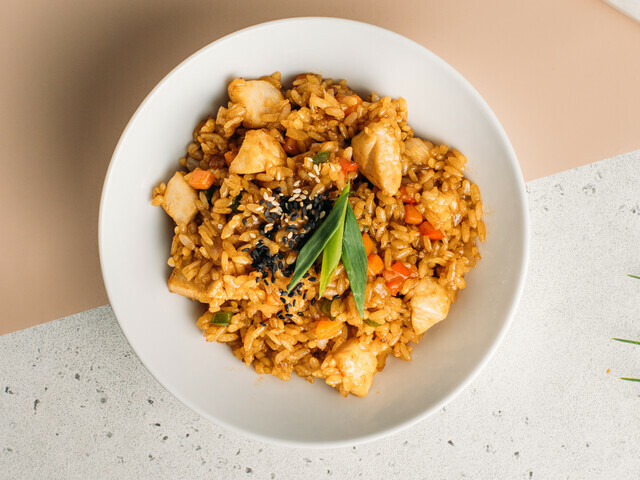 Курица, рис, морковь, лук, перец болгарский, соус терияки, масло кунжутное, кинза, кунжут.