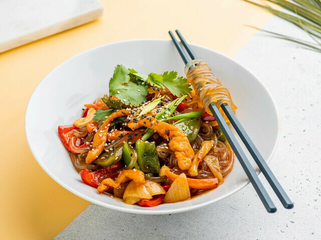 Стекляная лапша, куриное филе, болгарский перец, морковь, лук, капуста белокочанная, специи, тайский соус.