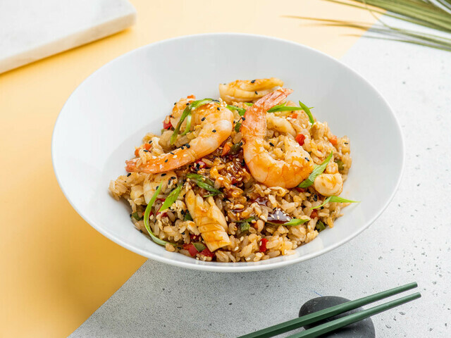 Креветки, кальмар, рис, морковь, лук, перец болгарский, соус терияки, кунжут.