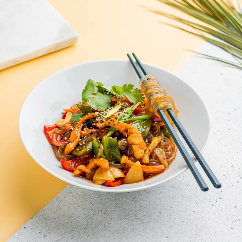Стекляная лапша, куриное филе, болгарский перец, морковь, лук, капуста белокочанная, специи, тайский соус.