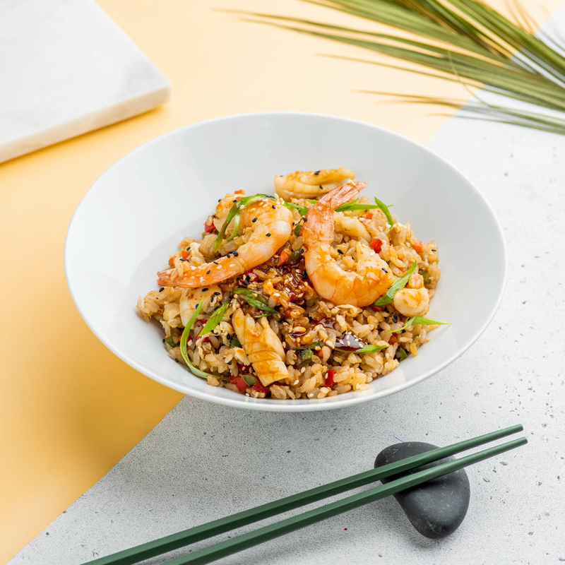 Креветки, кальмар, рис, морковь, лук, перец болгарский, соус терияки, кунжут.