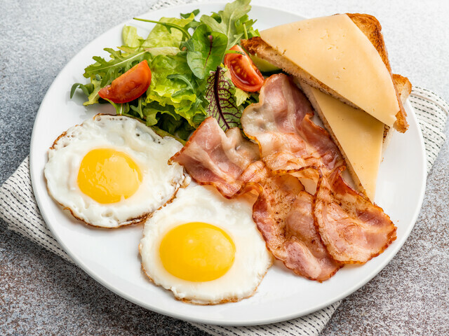 Яйца, бекон, микс салата, сыр, тост из пшеничного хлеба