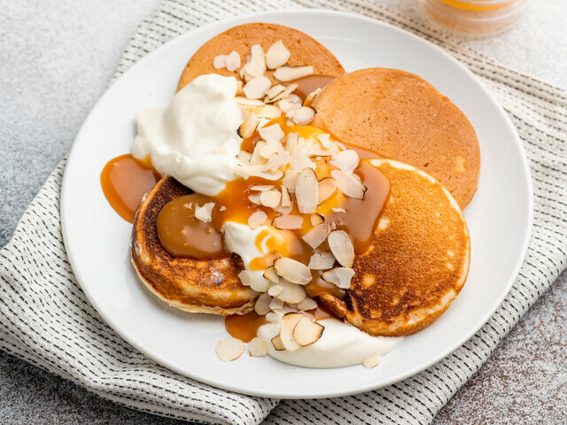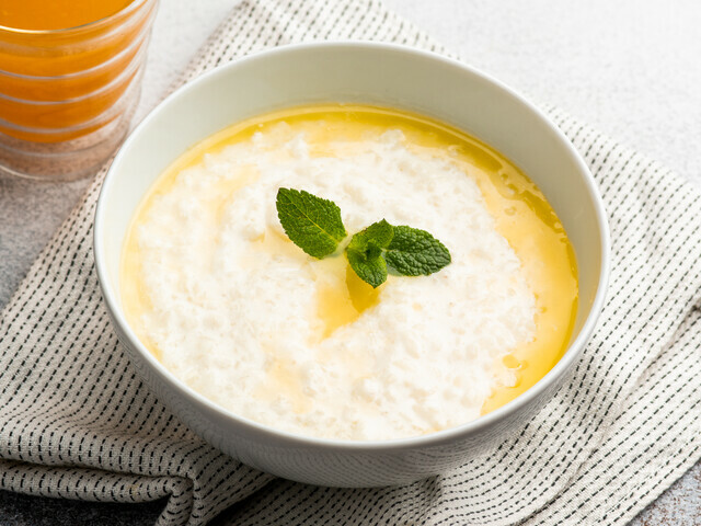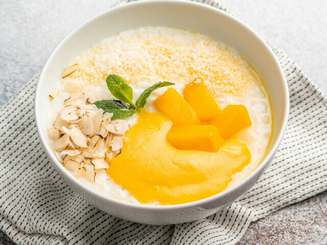 Рис, молоко, манговый мусс, лепестки миндаля, кокосовая стружка, масло сливочное, мята