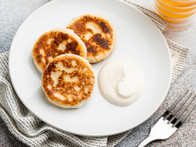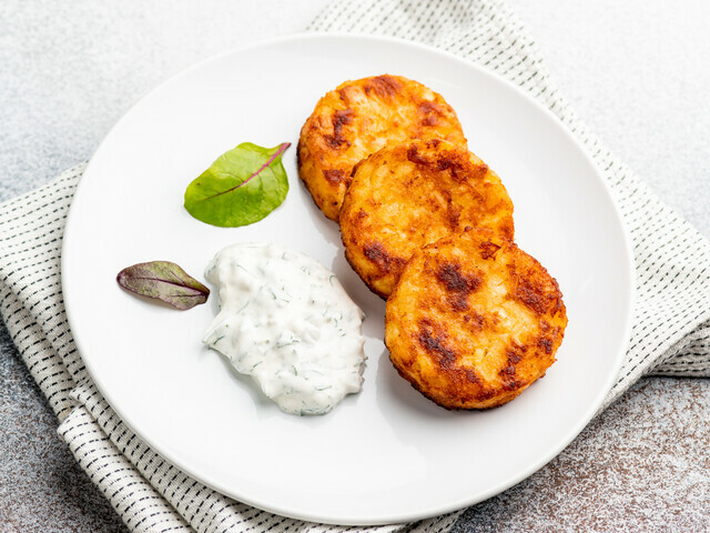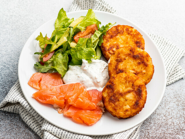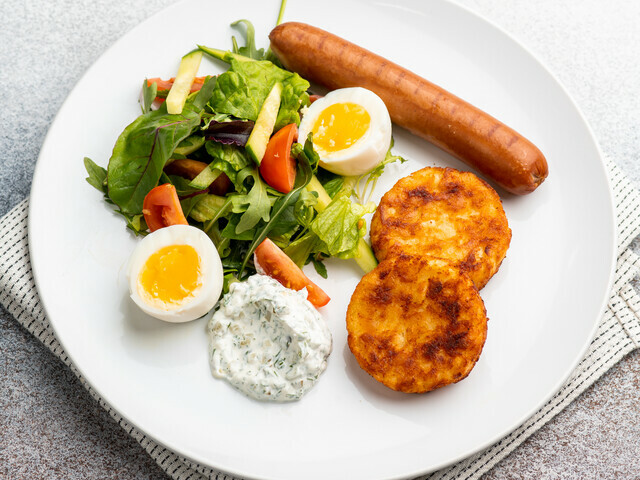 Картофельные драники, сосиска, яйцо варёное, микс салата, сливочный соус