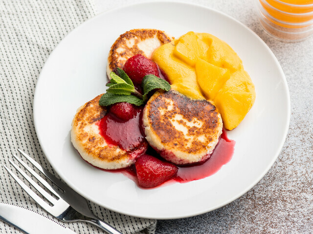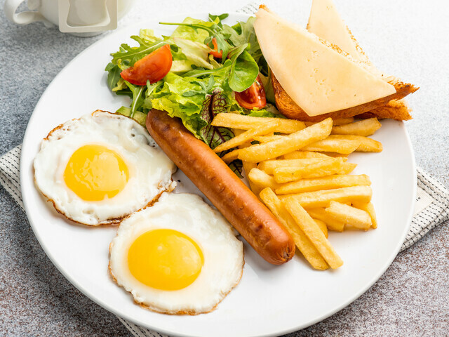 Яйца, сосиска, картофель фри, микс салата, сыр, тост из пшеничного хлеба