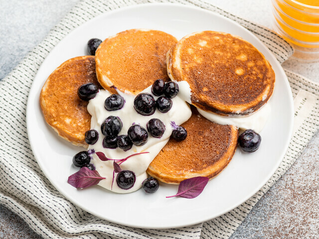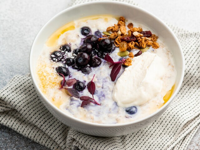 Овсяные хлопья, молоко, черника, ванильный соус, масло сливочное, стружка кокосовая, мята.