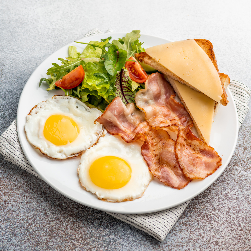 Яйца, бекон, микс салата, сыр, тост из пшеничного хлеба