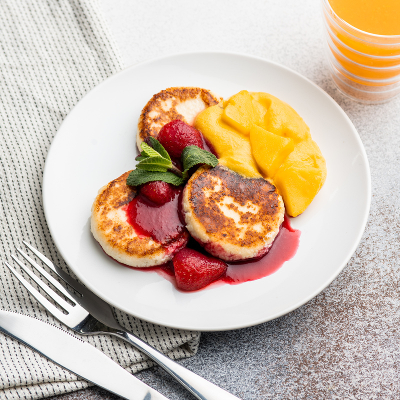 Творожные сырники, манго, ягодный соус