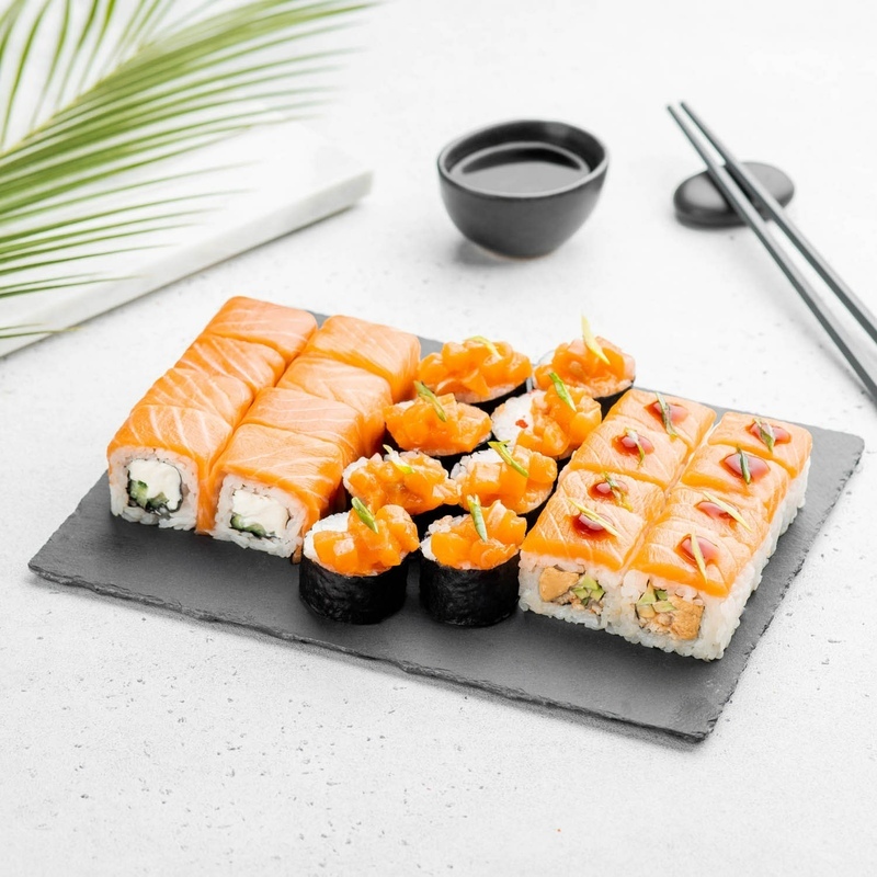 Нежная филадельфия с лососем, лосось с угрем и соусом унаги, острый лосось с омлетом и креветкой