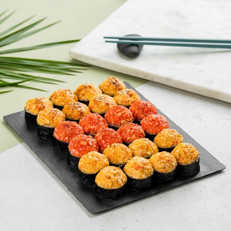 Унаги спайси запечённый, лосось спайси запечённый, креветка том ям запечённый