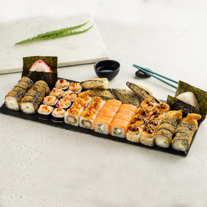 Темпура с лососем и креветкой, запечённый ролл слососем и чесночным крабом, особый с лососем, нежная филадельфия с лососем, запечённый с лососем - шапка Пармезан, темпура "Динамит", онигири лосось с соусом спайси, онигири с курицей терияки, сендвич ролл с курицей, сендвич ролл с лососем.