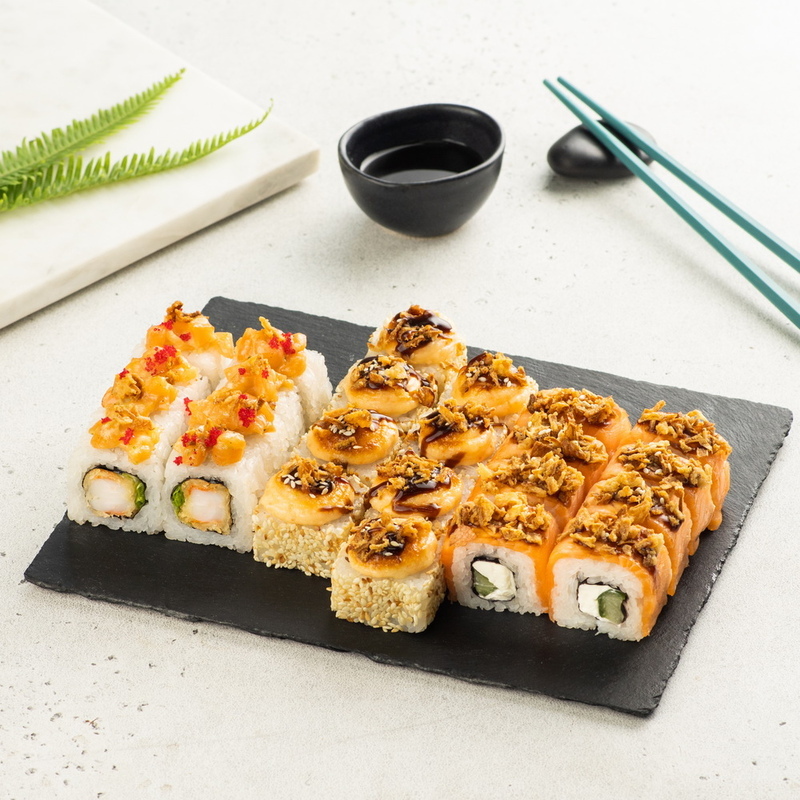 Особый с лососем, запечённый ролл с лососем - шапка Пармезан, филадельфия криспи.